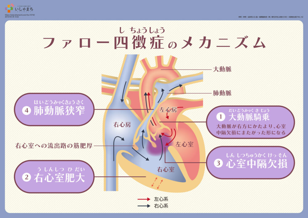 ファロー四徴症は、チアノーゼ(皮膚や粘膜が青紫色になる状態)を伴う代表的な先天性心疾患であり、心室中隔という壁の大きな穴(心室中隔欠損)、大動脈が左右の心室にまたがること(大動脈騎乗)、肺動脈の出口が狭くなること(肺動脈狭窄)、そして右心室の壁が厚くなること(右室肥大)という、四つの解剖学的異常を併せ持つ、極めて複雑な病態である。
