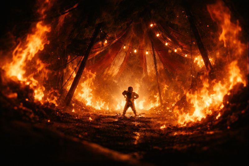 炎に包まれたテントは、現実と幻想の境界線そのものだ。