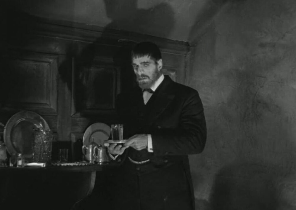 屋敷の扉を開けたのは、顔に大きな傷跡を持つ、言葉を話さない不気味な執事モーガン(ボリス・カーロフ)であった 。