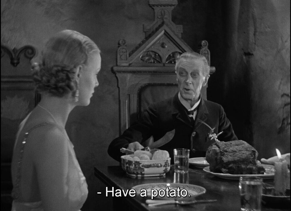 緊張感あふれる晩餐の席でホレース・フェムが発する象徴的な台詞、「ポテトはいかがかね?」。これは単なる冗談ではない。本作の特異なトーンを決定づける、純粋な不条理主義の瞬間である。