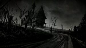 車中の彼らの会話は、ウィットに富んだ夫婦喧嘩で彩られており、映画のコメディ的な側面を序盤から示唆している 。やがて土砂崩れによって道が寸断され、彼らは前方にそびえ立つ古びた不気味な屋敷に避難を求めることを余儀なくされる 。