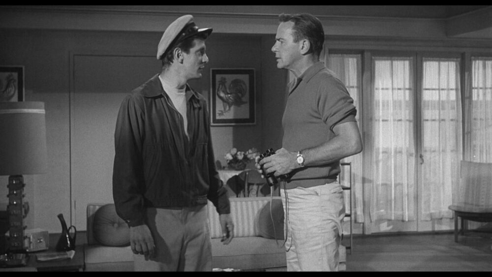 ラズロの卓越した手腕は、『空飛ぶ生首』にB級映画の枠を遥かに超えた映像的な洗練をもたらしている。彼はハイコントラストな白黒撮影を駆使し、フィルム・ノワール特有の雰囲気を巧みに作り出した。陽光あふれるカリフォルニアの海辺の町を、深く表現主義的な影で覆い尽くすことで、主人公トムの内なる闇と罪悪感を視覚的に表現したのである 。