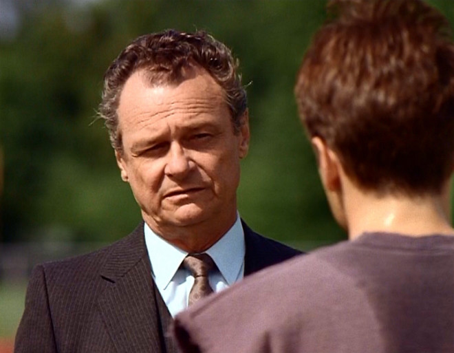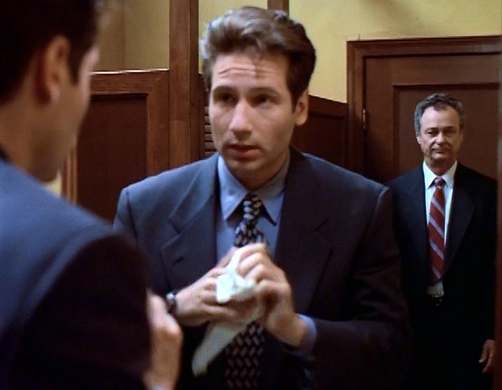 モルダーがトイレに立つ。すると、見知らぬ男が横に立つ。60代くらいの白髪の紳士。高級なスーツ。政府高官の風格。